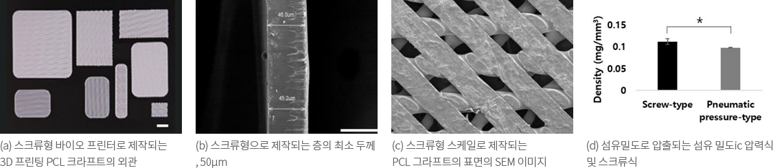 스크류형 바이오 프린터에 의해 제조된 PCL 단일 파이버의 인장 강도는 29.18±2.10 MPa, 3D 구조체의 인장 강도는 6.18±0.15MPa, 굽힘 강도는 7.99±1.60MPa 값을 나타내었다.